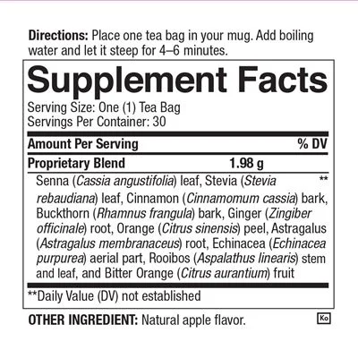 - Apoyo Digestivo: Esta mezcla única de hierbas promueve un sistema digestivo saludable. Su agradable combinación de manzana natural y el toque de canela proporciona un sabor delicioso que puede hacer que el proceso de mantener un tracto gastrointestinal limpio y sano sea más placentero.