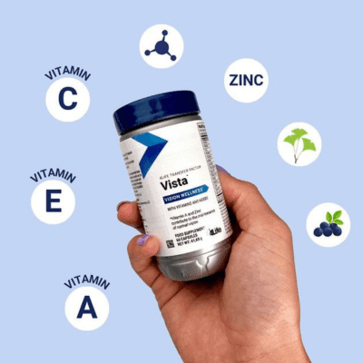 Vista is a food supplement designed to support healthy eyesight. Each bottle contains 60 capsules, with a net weight of 40.92 grams. The supplement combines a variety of ingredients aimed at promoting optimal eye health, including Vitamin A and zinc, which help maintain normal vision, and antioxidants like Vitamins C and E, which protect cells from oxidative damage. Additionally, blueberry extract and ginkgo leaf extract enhance blood circulation in the eyes, while colostrum and egg yolk contribute to overall eye function and nourishment.